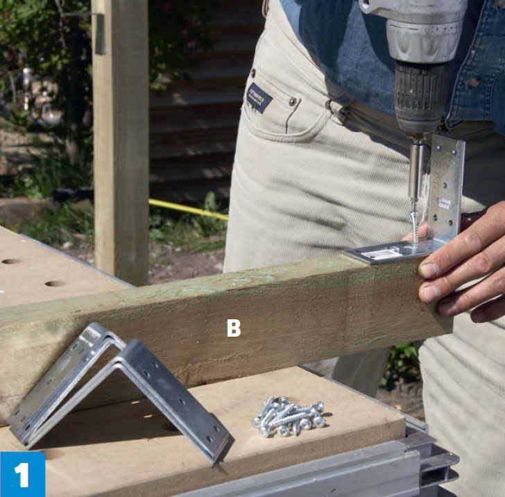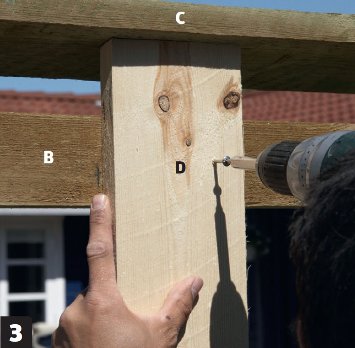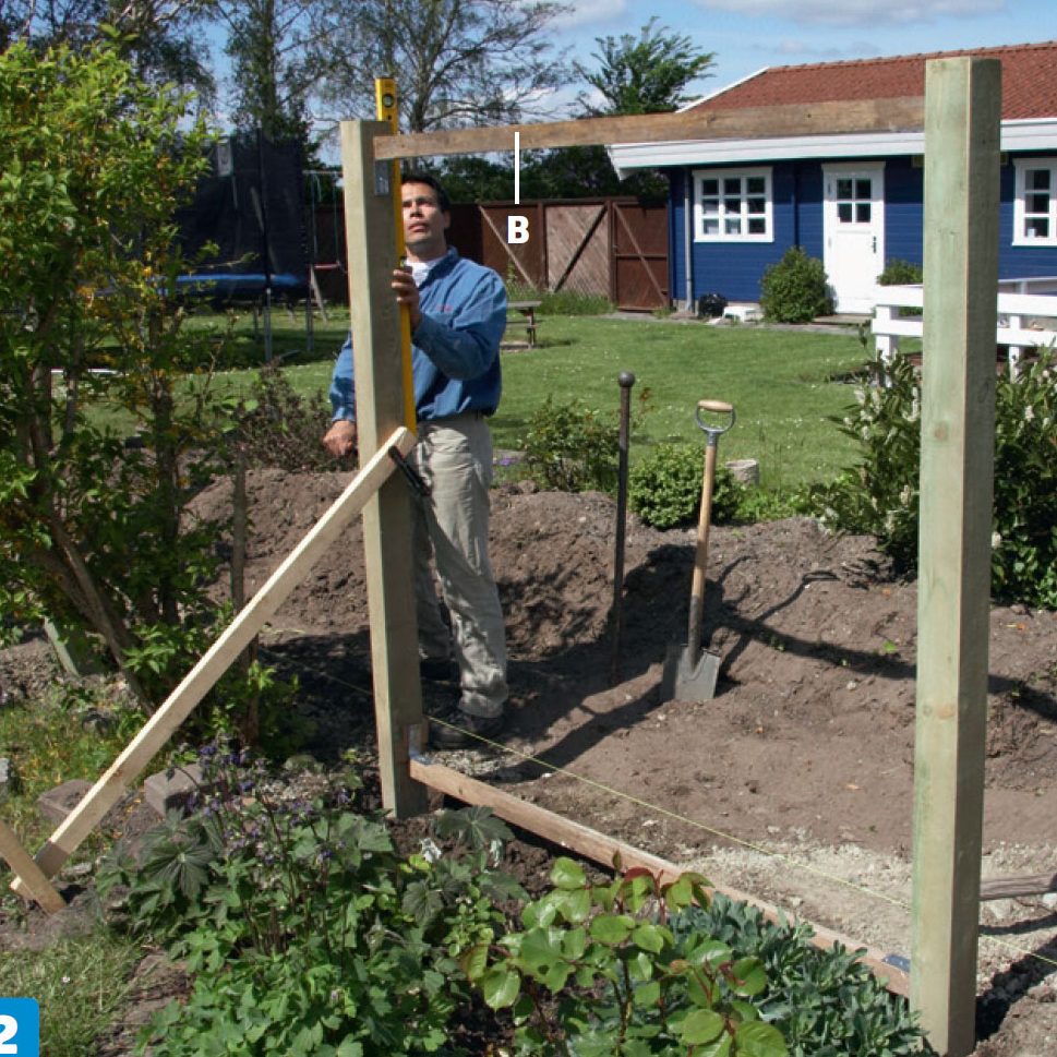 Sahaa kaksi koolausrimaa (B) ja pystytä loput tolpat niiden avulla. Kiinnitä koolausrimojen päihin kulmaraudat, jotta saat ruuvattua ne helposti tolppiin.