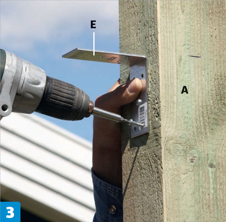 Ruuvaa kulmaraudat (E) tolppien (A) kummallekin puolelle koolausrimojen tueksi. Kiinnitä kulmaraudat 5x40 millin ankkuriruuveilla niin, että ne kannattelevat ylimpiä koolausrimoja.