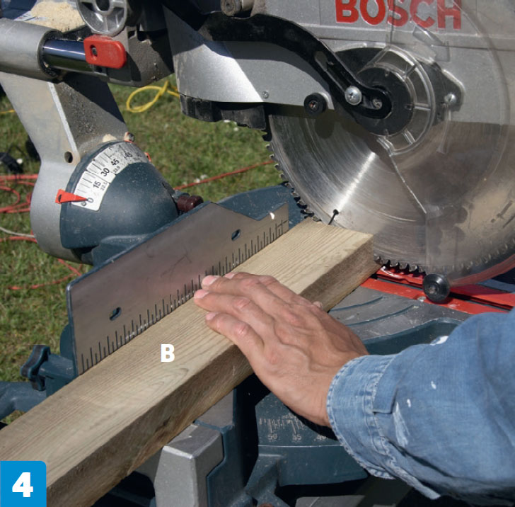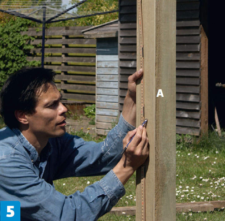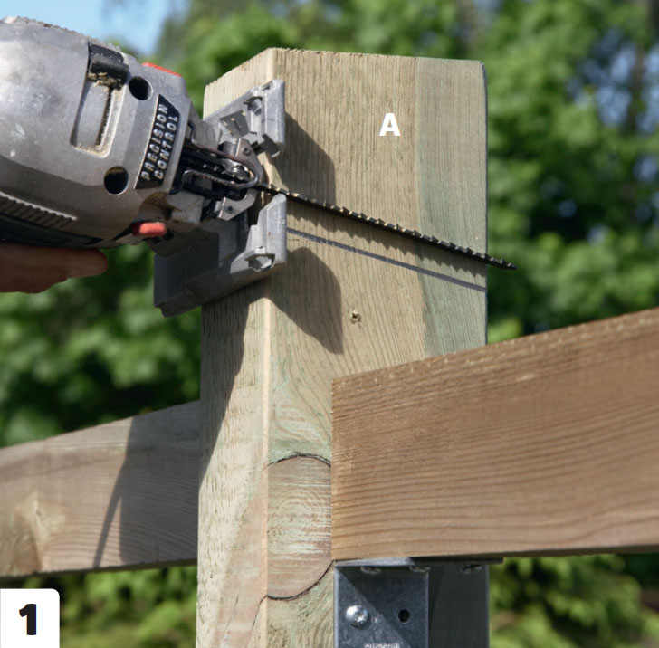 Piirrä tolpan (A) päähän viiva 10-15 asteen kulmassa ja sahaa tolppa poikki. Se on helpointa tehdä pistosahalla ja pitkällä terällä, mutta voit käyttää myös käsisahaa.