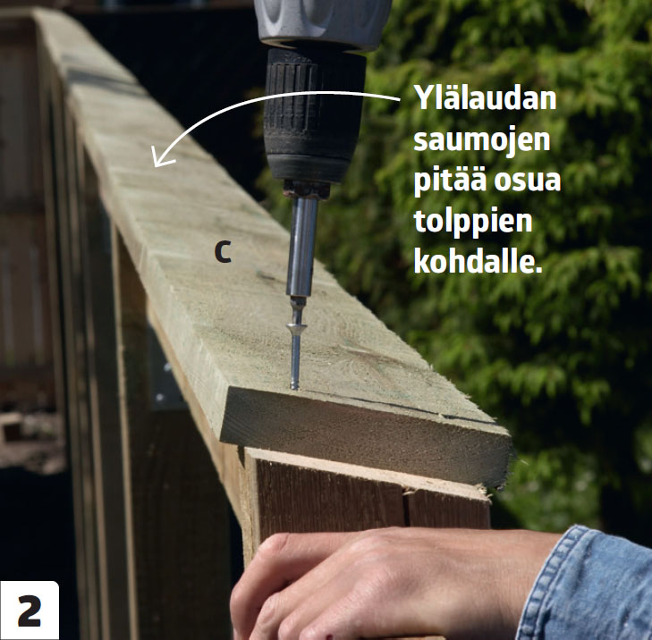 Paina lauta (D) ylälautaa (C) vasten merkin mukaan. Varmista, että lauta tulee pystysuoraan ja ruuvaa se kiinni kahdella 4,5x50 millin ruostumattomalla ruuvilla joka kohdasta.