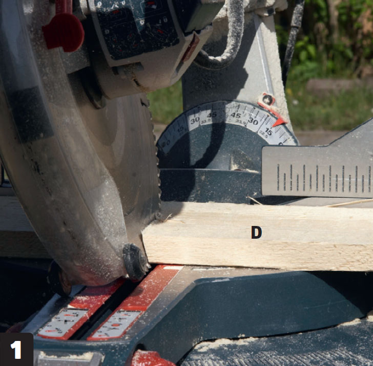 Sahaa kaikki laudat (D) sopivan pituisiksi. Yläpäät sahataan viistossa kulmassa, jotta ne sopivat tiiviisti ylälautaa (C) vasten. Voit sahata myös alapäät viistoon, jotta vesi valuu nopeasti maahan.