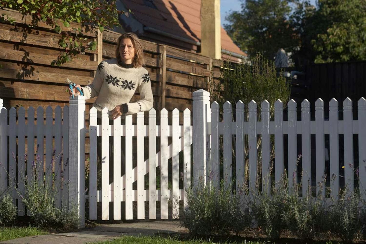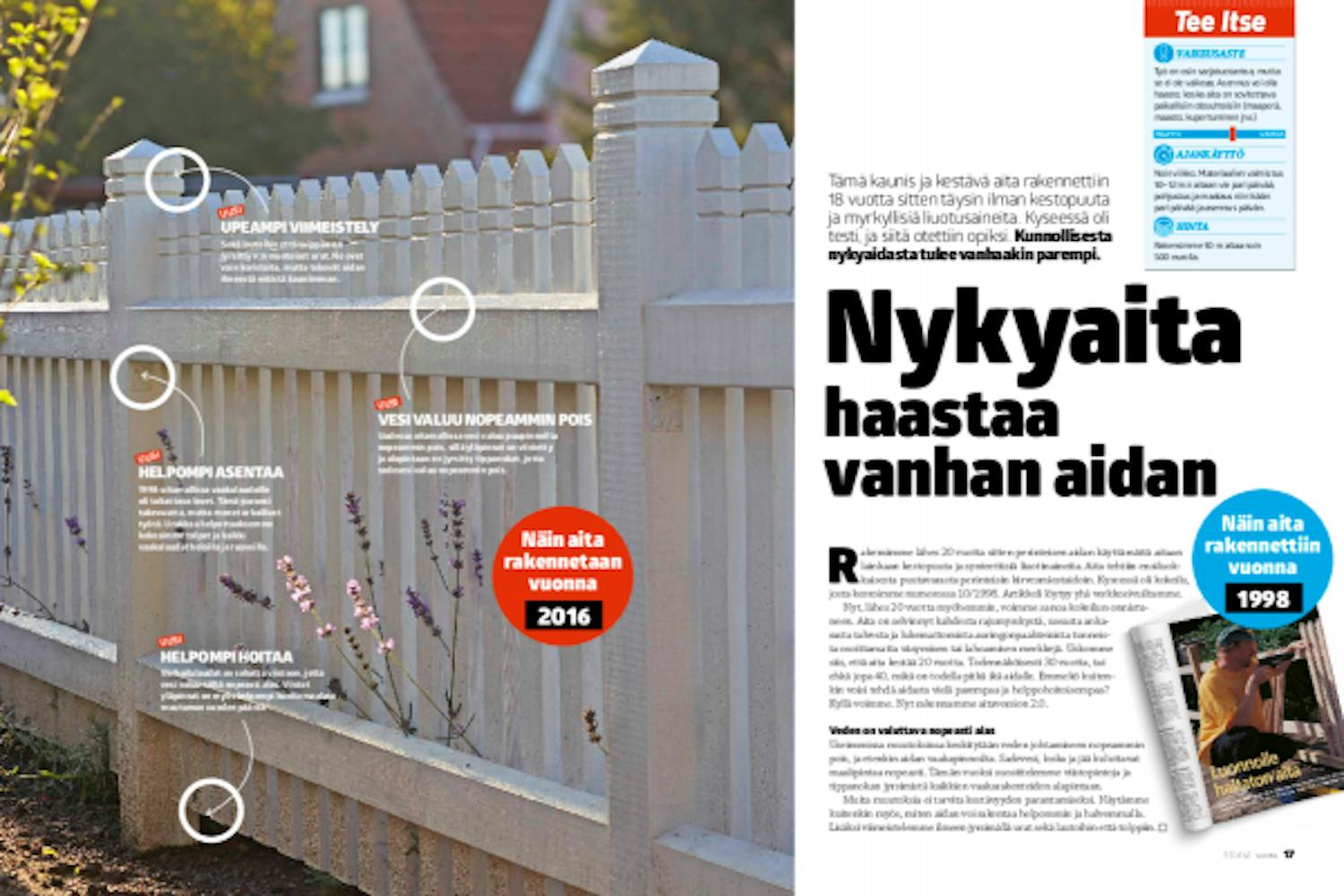 Vuonna 1998 teimme verhoilu-laudat 21 x 68 mm:n höylätystä siperiankuusesta. Se on turhankin kallis materiaali. Tällä kertaa ostimme sahapintaisia muotti lautoja, jotka höyläsimme molemmin puolin, sahasimme oikeaan pituuteen ja halkaisimme pituussuuntaan. Näin saimme 21 x 60 mm:n hyvälaatuisia lautoja. Jokainen lauta on 95 cm pitkä. Aidasta tuli useita satoja euroja edulli-sem pi rakentaa, sillä höylätty puu on yllättävän kallista. Lautojen alareunat viistettiin puun suojaamiseksi.