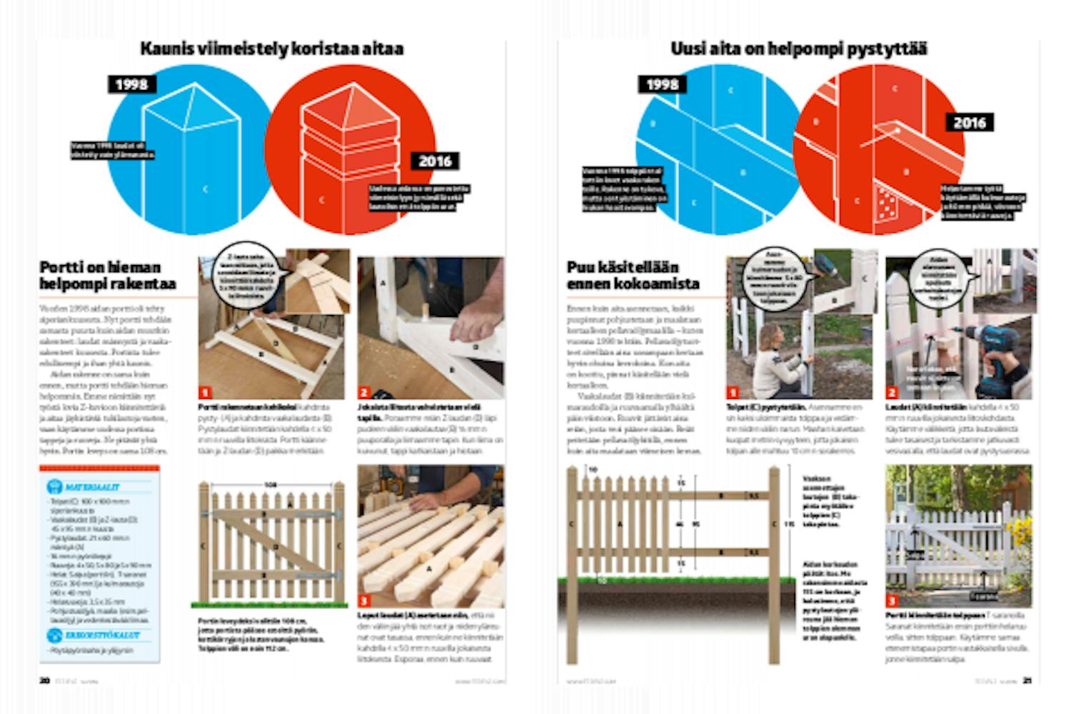 Aidan rakenne on sama kuin ennen, mutta portti tehdään hieman helpommin. Emme nimittäin nyt työstä lovia Z-kuvioon kiinnitettäviä ja aitaa jäykistäviä tukilautoja varten, vaan käytämme uudessa portissa tappeja ja ruuveja. Ne pitävät yhtä hyvin. Portin leveys on sama 108 cm.