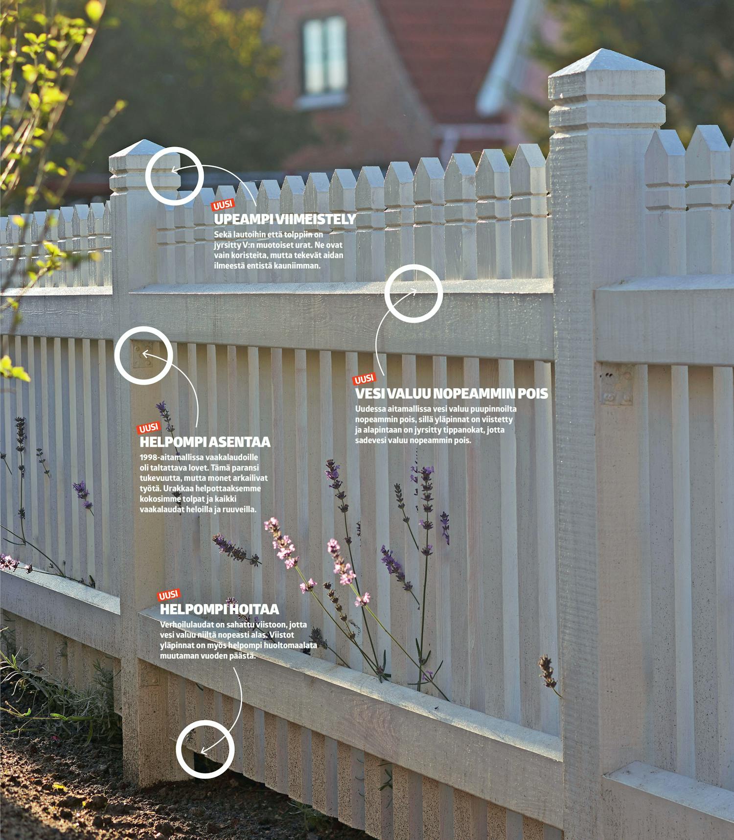 Vaakalaudat (B) kiinnitetään kul-ma raudoilla ja ruuvaamalla ylhäältä päin viistoon. Ruuvit jättävät aina reiän, josta vesi pääsee sisään. Reiät peitetään pellavaöljykitillä, ennen kuin aita maalataan viimeisen kerran.