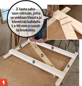 - Vaakalaudat (B) ja Z-lauta (D): 45 x 95 mm:n kuusta
