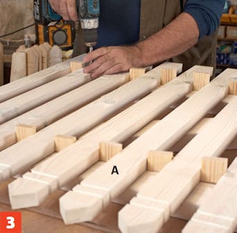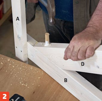 Jokaista liitosta vahvistetaan vielä tapilla. Poraamme reiän Z-laudan (D) läpi puoleen väliin vaakalautaa (B) 16 mm:n puuporalla ja liimaamme tapin. Kun liima on kuivunut, tappi katkaistaan ja hiotaan.