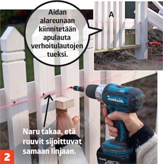 Laudat (A) kiinnitetään kahdella 4 x 50 mm:n ruuvilla jokaisesta liitoskohdasta. Käytämme välikkeitä, jotta lautaväleistä tulee tasaisest ja tarkistamme jatkuvasti vesivaa’alla, että laudat ovat pystysuorassa.