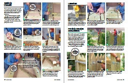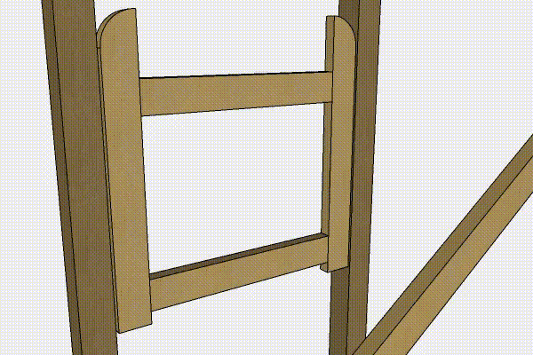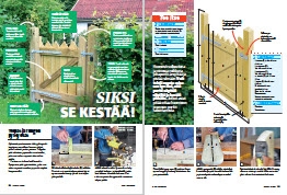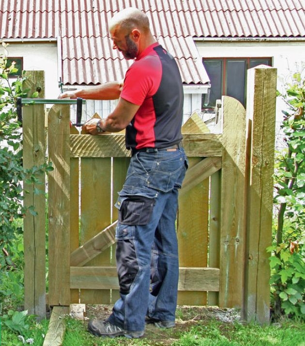 Rungon liitokset lujitetaan tapeilla, joille pitää porata reiät. Tapit lyödään paikoilleen ja kiinnitetään liimalla. Kun runko on koottu, mittaa vino tuen paikka. Vinotuki on tärkeä, sillä se pitää portin suorana.