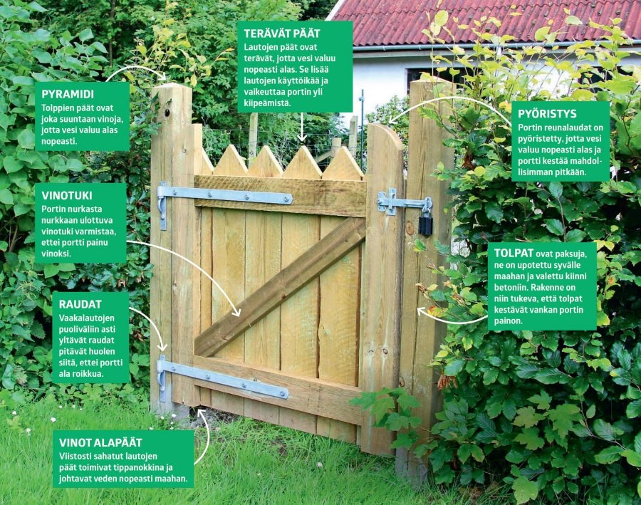 Portissa on tukeva lankkurunko. Pystyosien päät pyöristetään, jotta vesi valuu nopeasti maahan ja portti näyttää kevyemmältä.