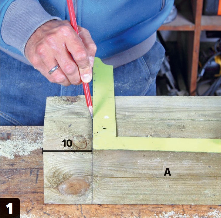 Merkitse sahauslinjat tolpan (A) päähän. Piirrä viiva 10 senttiä tolpan päästä, käytä apuna suorakulmaa ja piirrä viivat tolpan joka puolelle.