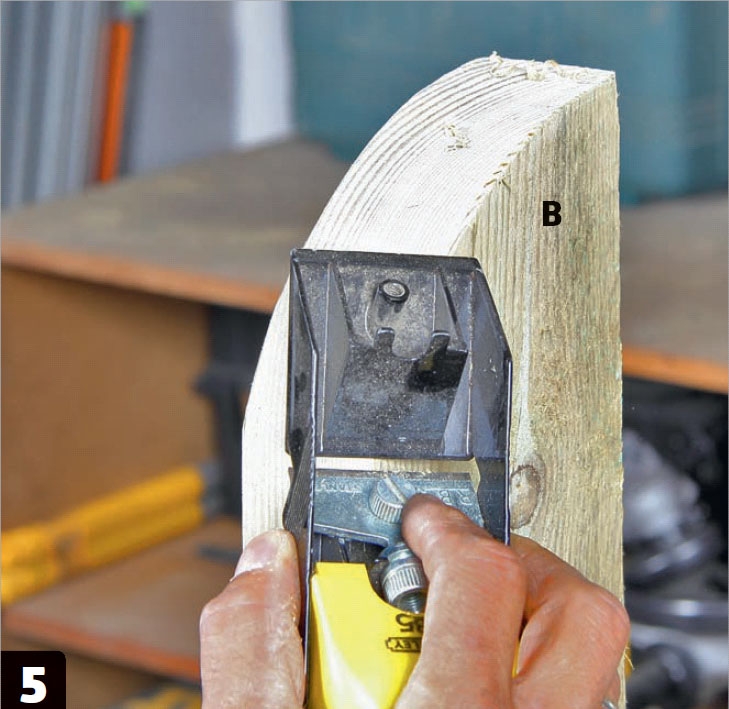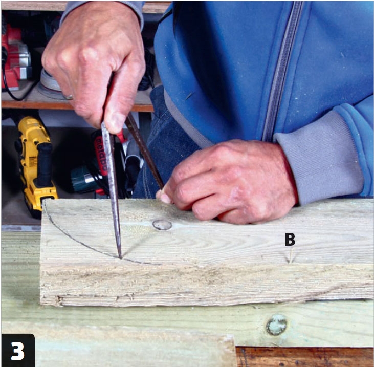 Piirrä kaari pystyosan (B) päähän. Käytä apuna harppia ja sahaa ylimääräinen osa pois pistosahalla.