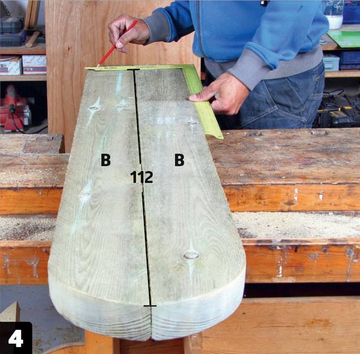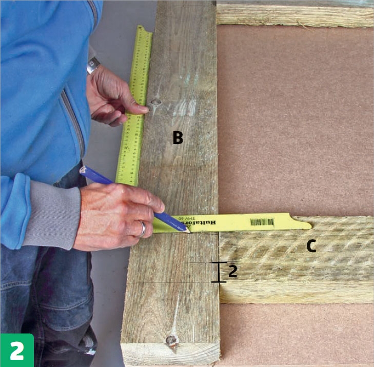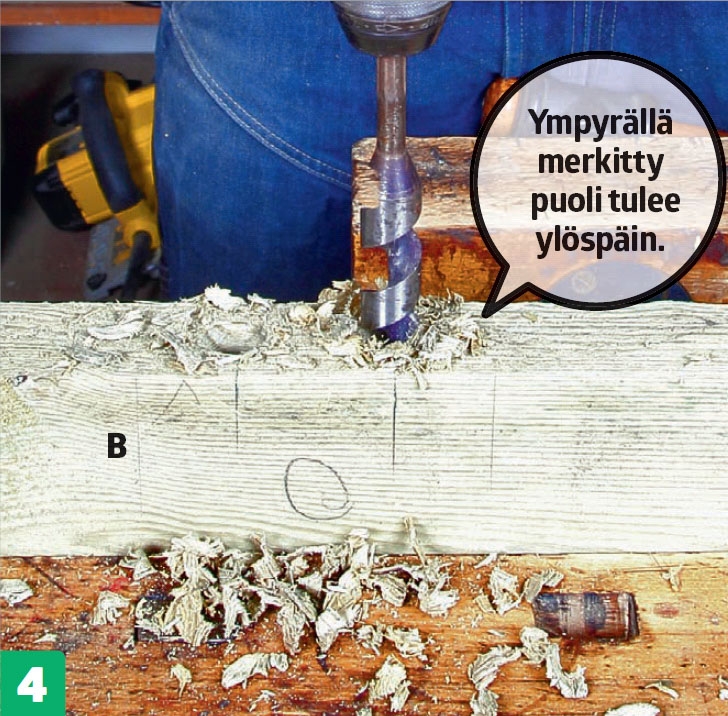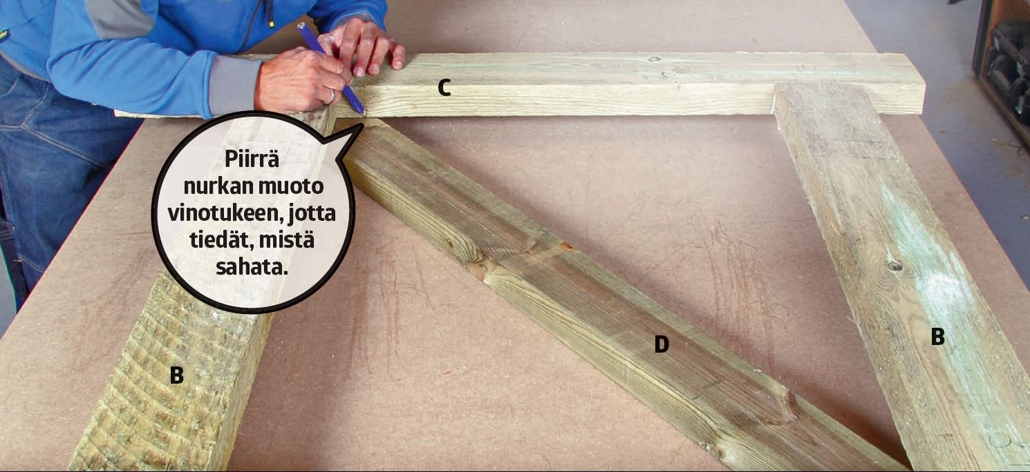 Sahaa pystyosat (B) oikean pituisiksi. Aseta lautojen päät samalle korkeudelle ja piirrä alapään sahauslinjat suorakul-man avulla.