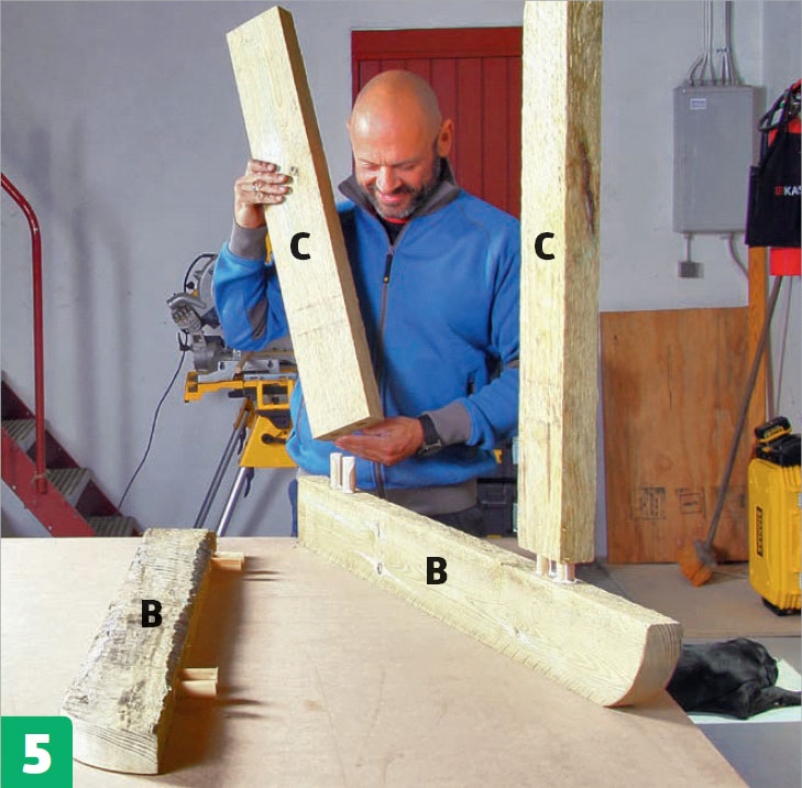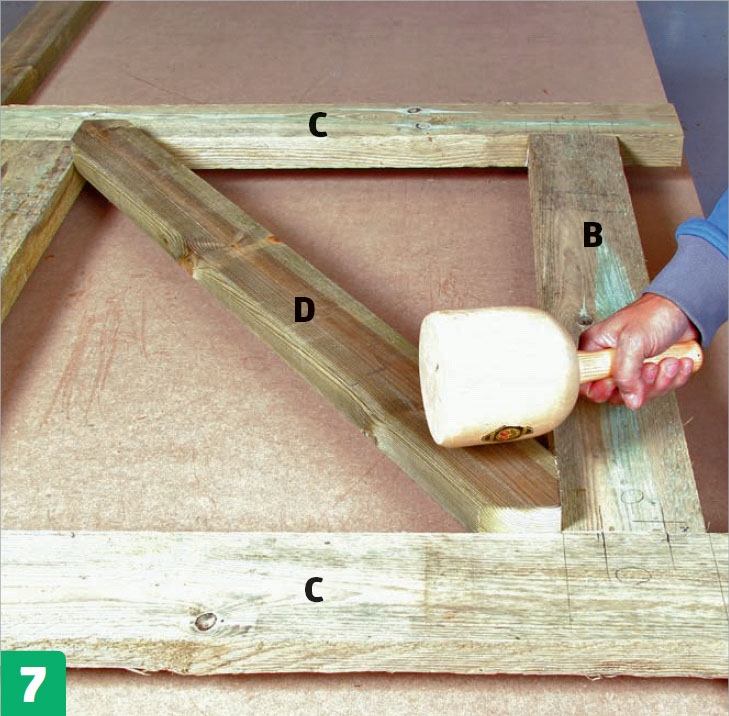 Kokoa runko. Teroita tapit ensin, levitä niihin ulkokäyttöön sopivaa liimaa ja lyö ne kuuden sentin syvyyteen pystyosiin (B). Aseta vaakaosat (C) tappien päälle ja lyö ne paikoilleen.