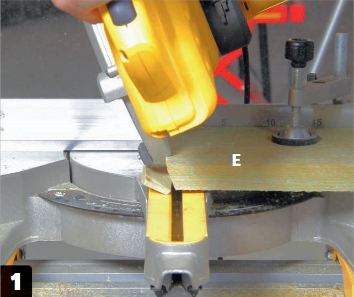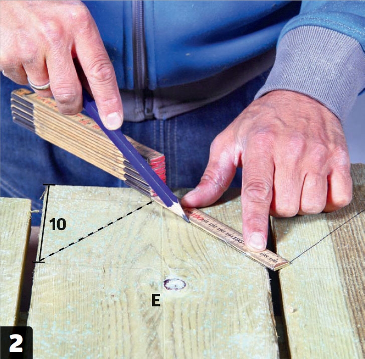 Sahaa portin laudat (E). Tee alapäistä viistot, jotta vesi valuu nopeasti maahan. Se pidentää puun käyttöikää. Tämä katkaisu- ja jiirisirkkeli on säädetty 25 asteen kulmaan.