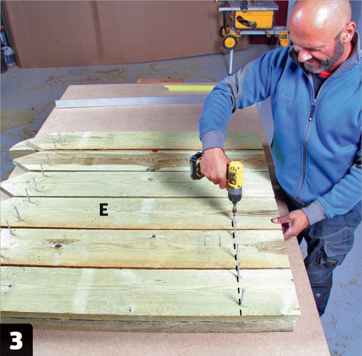 Tee terävät kärjet lautojen (E) yläpäähän, jotta vesi valuu alas ja portin yli on vaikeampi kiivetä. Sahaa laudat ja pyöristä terävät reunat viilalla tai höylällä.