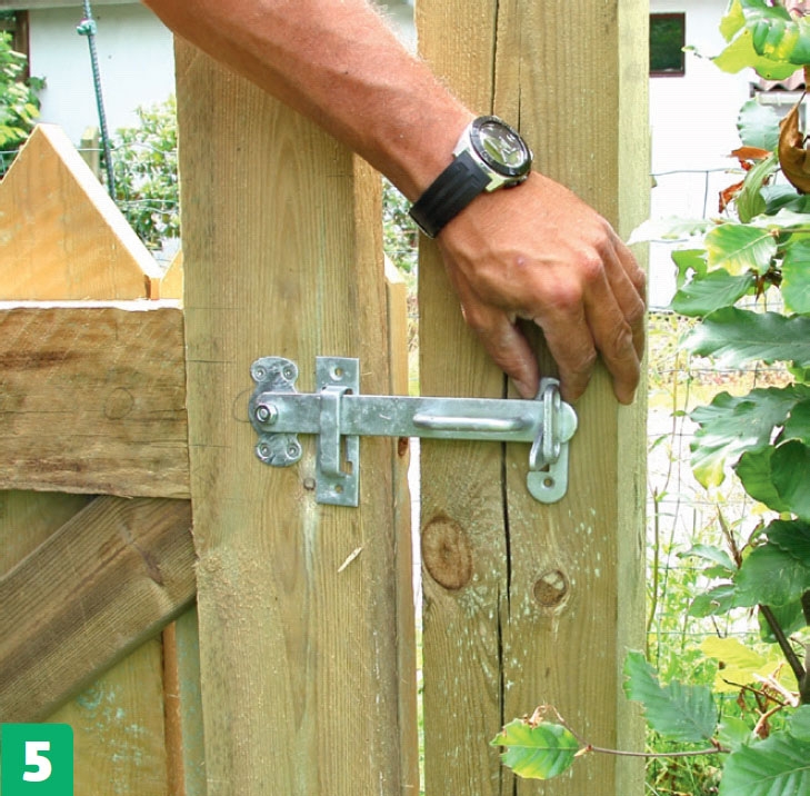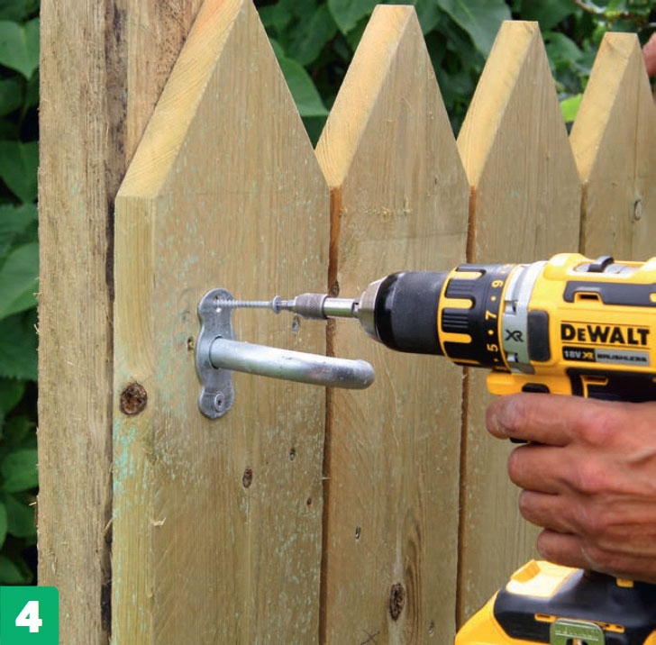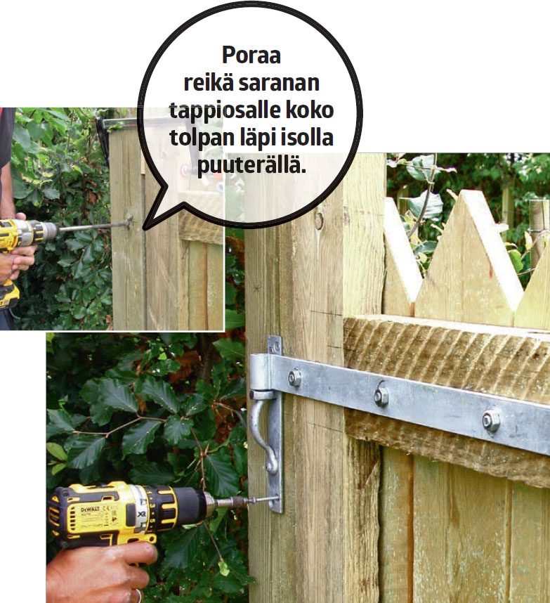 Mittaa kahvan paikka ja asenna se lukko-puolelle. Poraa porttiin aluksi reikä isolla puuterällä. Reiän pitää olla millin isompi kuin kahvan. Kiinnitä kahva portin taka-puolelta mutterilla.