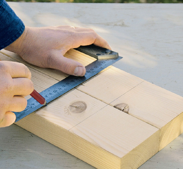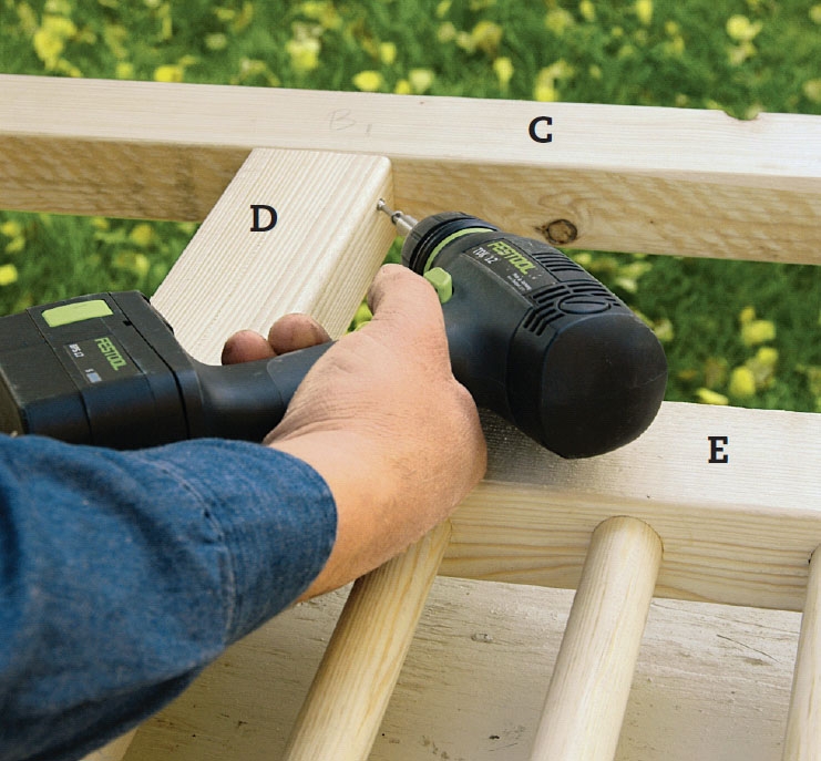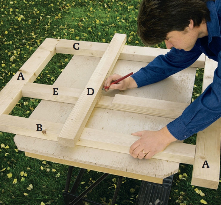 Ota mitat keskimmäistä vaakalautaa (D) ja pystylautaa (E) varten, jotta voit sahata ja taltata liitoskohdat. Liimalla ja ruuveilla lapaliitoksin kootusta portista tulee vahva ja kestävä.