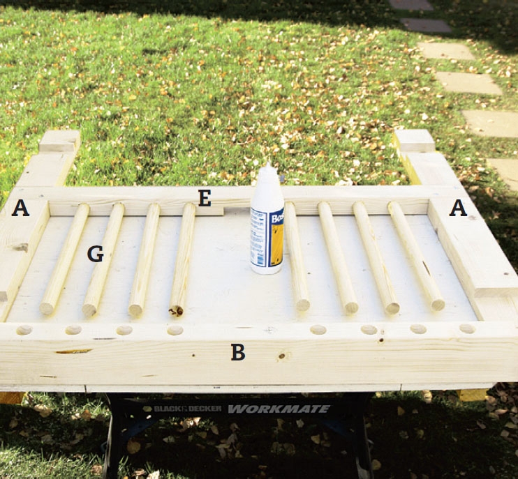 Aseta pyörökepit (G) paikoilleen porattuihin reikiin, joiden pohjalle on laitettu hieman pu-liimaa. Aloita poikki-jäykistäjän (D) kohdalta ja aseta pyörö-kepit varovasti alhaalta päin.