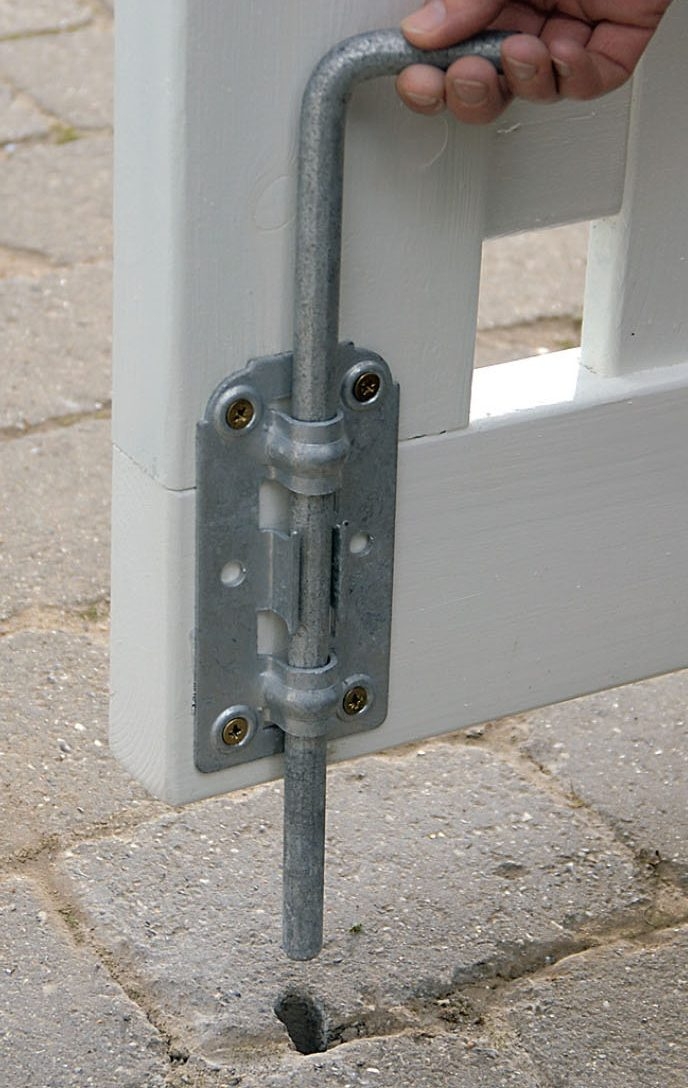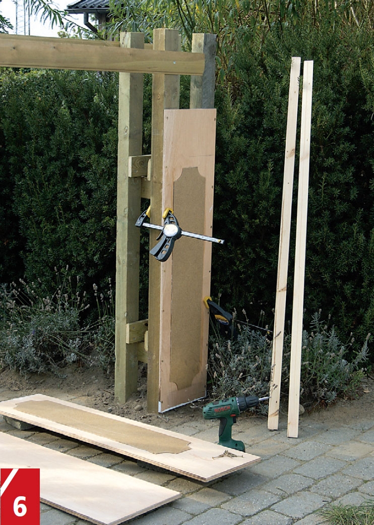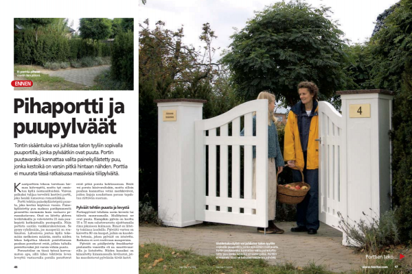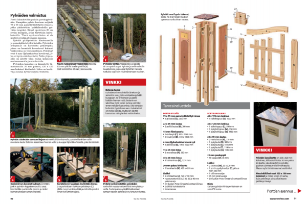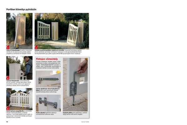 Portit kiinnitetään puisiin portinpylväi-siin. Kumpikin pylväs kootaan neljästä 75 x 75 mm painekyllästetystä rimasta, jotka yhdistetään poikkilaudoilla pyl-vään rungoksi. Rimat upotetaan 80 cm syviin kuoppiin, jotka täytetään kuiva-betonilla. Tämä upotusratkaisu ei ole kestävä routimattomassa maassa.