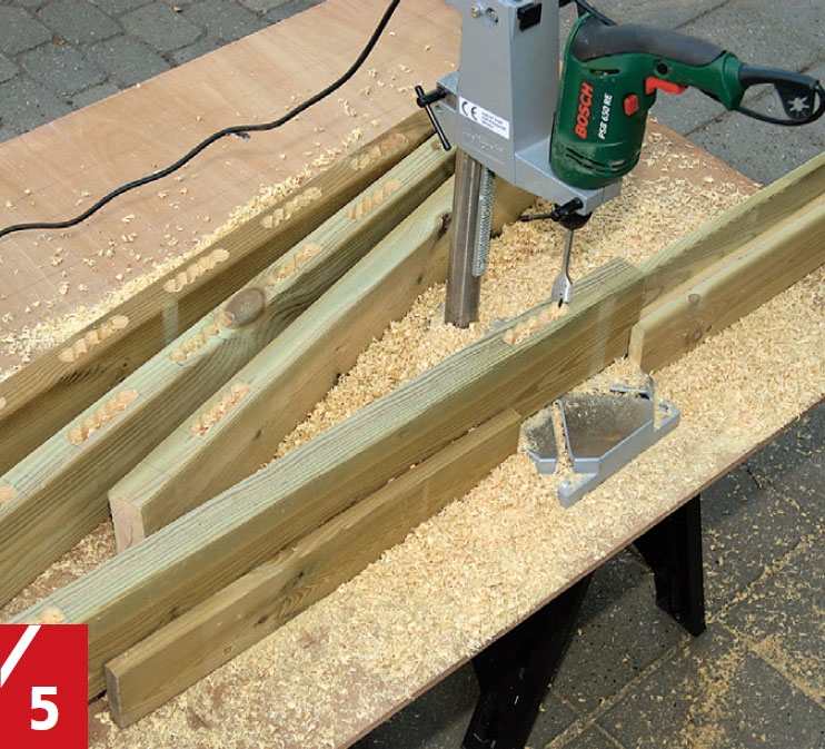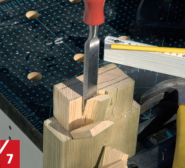 Pystyporausteline on tässä työssä kor-vaamaton apu, sillä lähes tehtävän loven leveyttä vastaavalla poralla porattavat reiät pitää porata kohtisuoraan. Reiät voi porata käsivaraltakin, mutta silloin ne pitää porata tarkasti merkkiviivojen suuntia noudattaen.