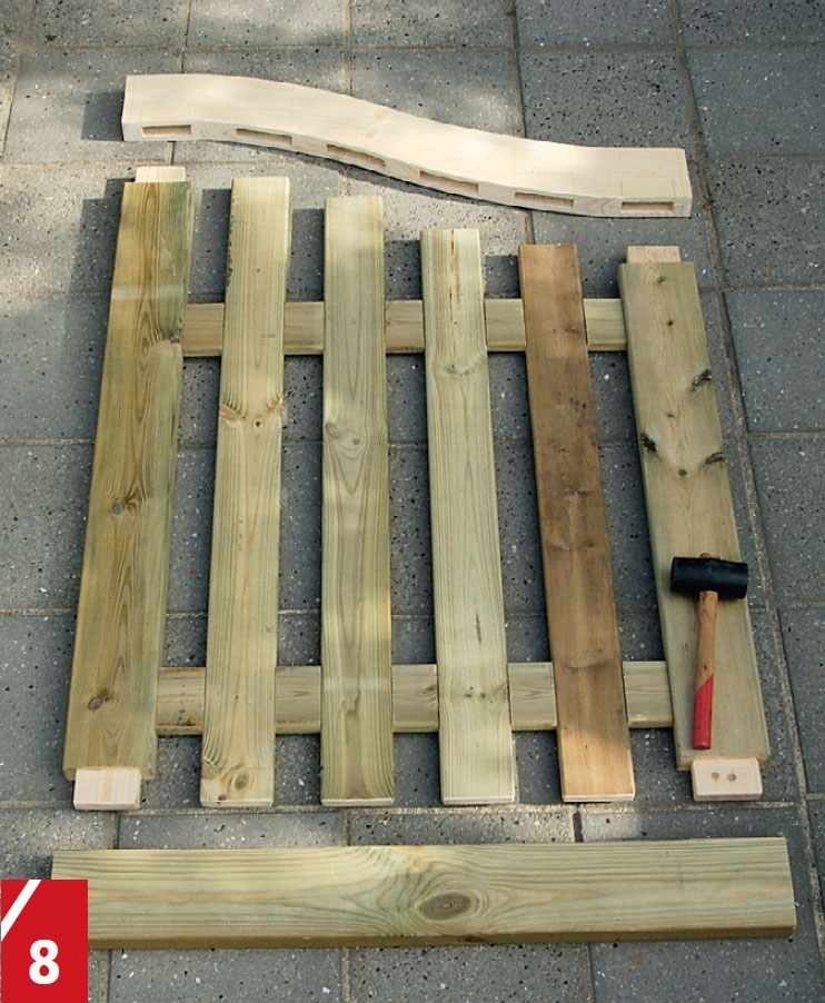Portin voi koota levyllä, johon osien sijoit -telu on merkitty oikealla olevan piirroksen mukaan. Portin laudat ovat höylättyä 22 x 95 mm lautaa. Niiden päät pitää katkaista ylävaakalaudan muodon mukaan.