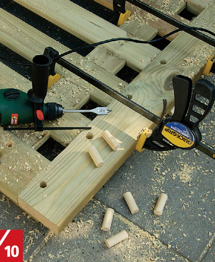 Osat kiinnitetään tiukasti yhteen puris timilla ja liitoksien läpi porataan 21 mm reiät puukepistä katkaistaville tapeille.