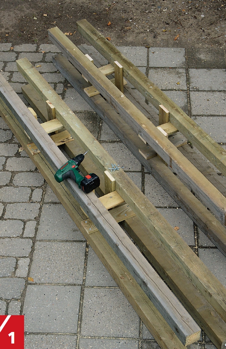 Pilarin runkorimat yhdistetään toisiinsa 300 mm pitkillä laudanpätkillä (B). Osat kiinnitettiin 60 mm yleisruuveilla.