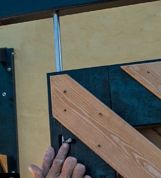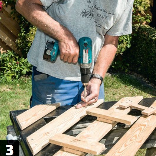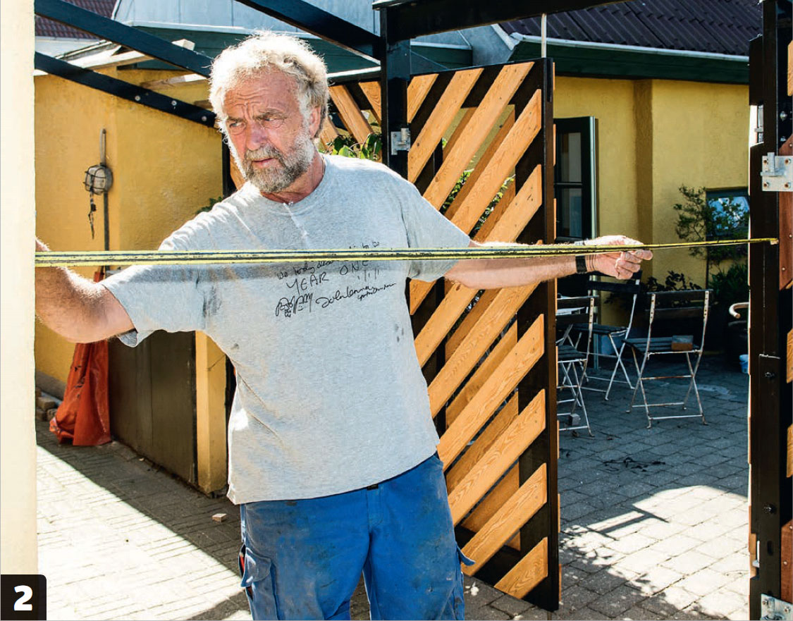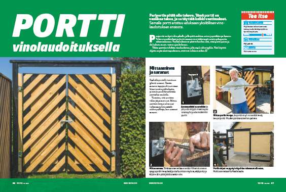 Nyt voit tehdä laudoituksen. Tämän portin vinolaudat asennetaan yhden sentin päähän portin reunoista. Apuna käytetään sapluunaa.