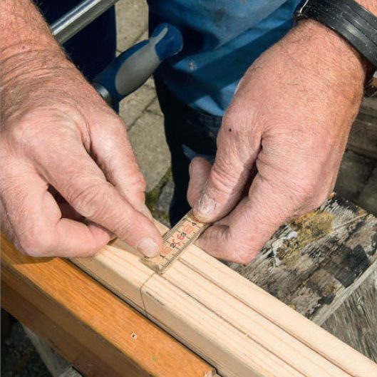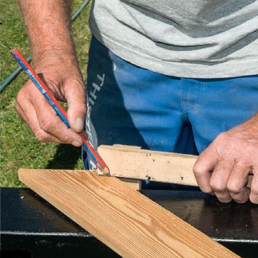 Aloita asentaminen. Lautojen päät jäävät 10 millin päähän rungon reunoista. Merkitse oikea kohta sapluunan avulla ja sahaa lauta.