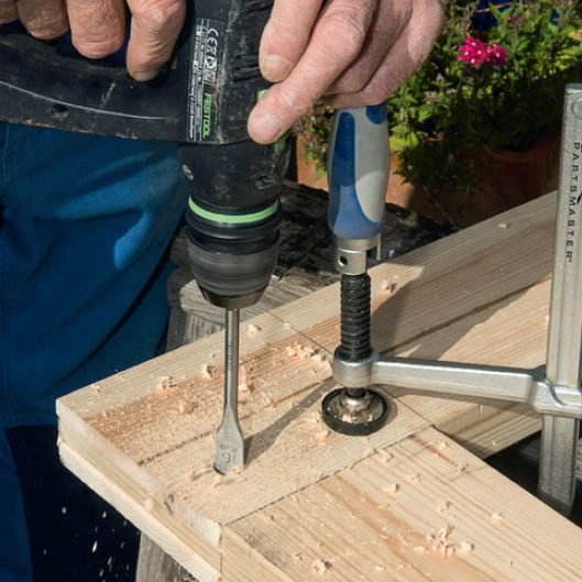 Poraa osiin reiät 16 millin lattaterällä. Poraa aluksi toiselta ja sitten toiselta puolelta, jotta pinnoista tulee mahdollisimman siistit.