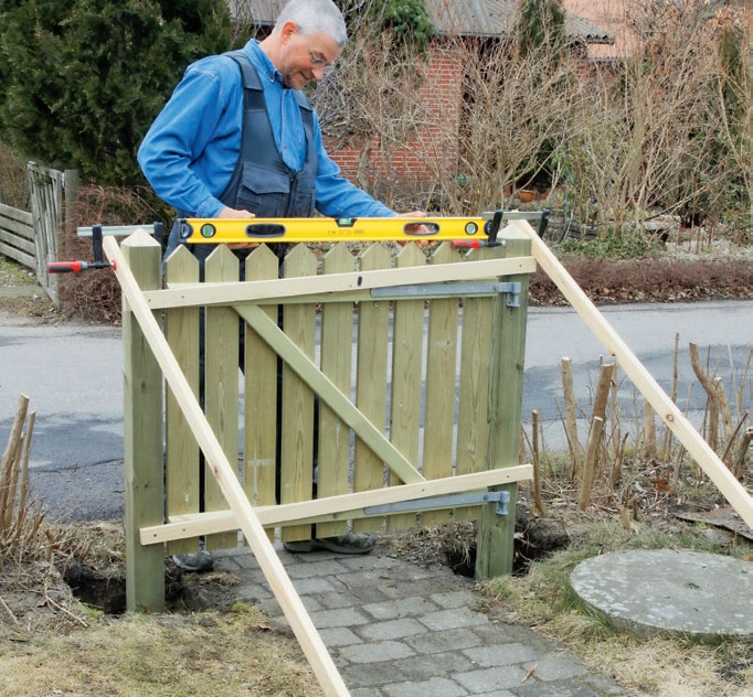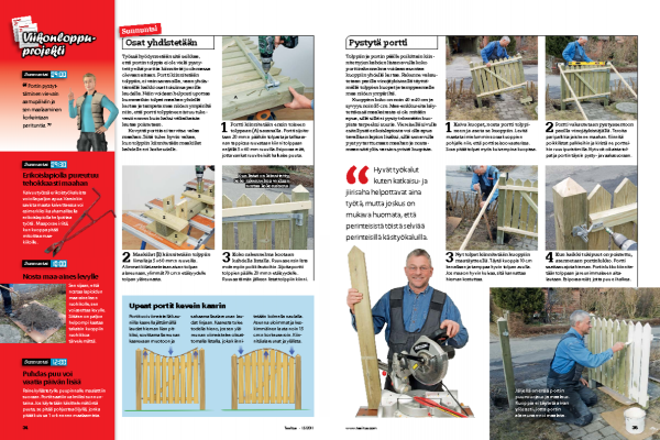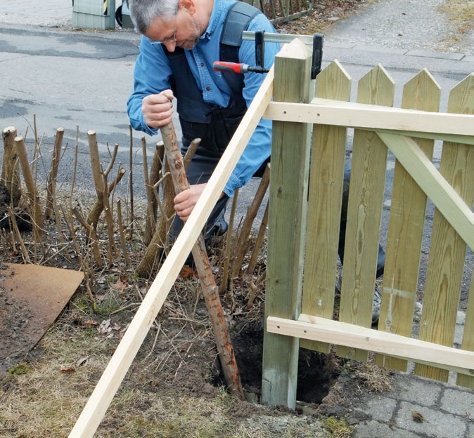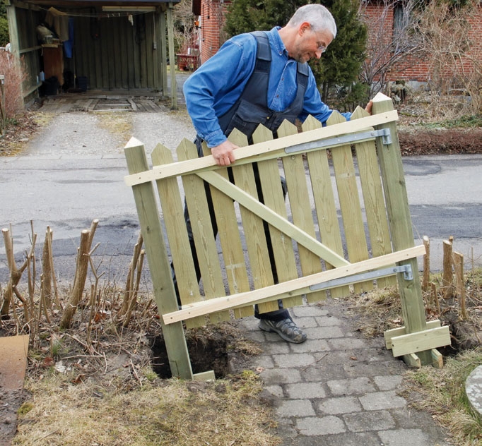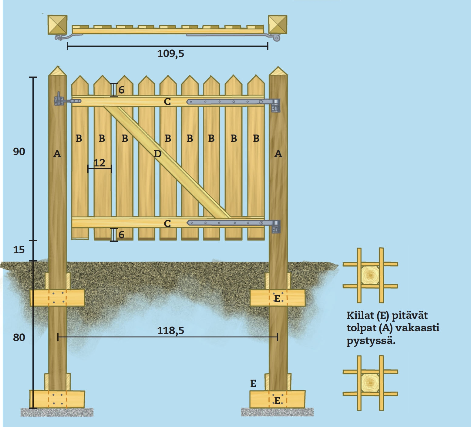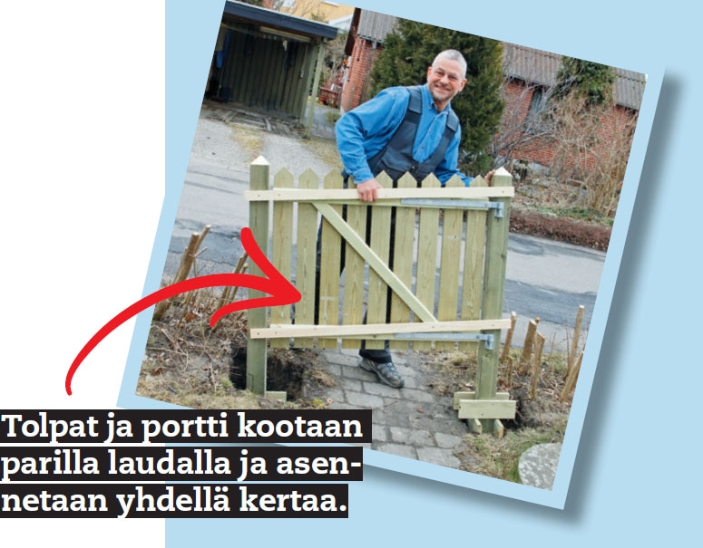 Työssä hyödynnetään sitä seikkaa, että portin tolppia ei ole vielä pysty-tetty eikä porttia kiinnitetä jo olemassa olevaan aitaan. Portti kiinnitetään tolppiin, ei vain saranoilla, vaan yhdis-tämällä kaikki osat toisiinsa parilla laudalla. Näin voidaan helposti upottaa kummatkin tolpat maahan yhdellä kertaa ja tampata maa niiden ympäriltä niin, että portti tolppineen istuu tuke-vasti ennen kuin kaksi väliaikaista lautaa poistetaan.