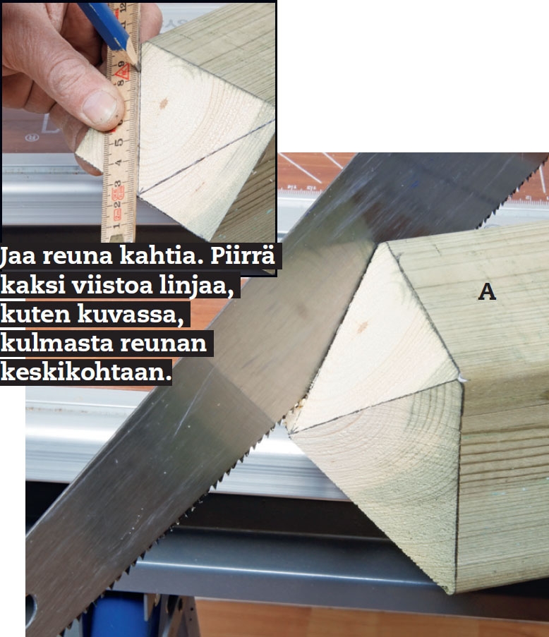 Tolppien (A) yläpää teroitetaan nel-jällä viillolla niin, että päähän muodostuu neljä kolmiomaista 45 °:n pintaa. Ensimmäis-tä viiltoa varten tehdään merkkiviiva tolpan ympäri 4,5 cm:n päähän tolpan päästä ja sitten keskelle päätyä. Merkitse sahauslinjat.