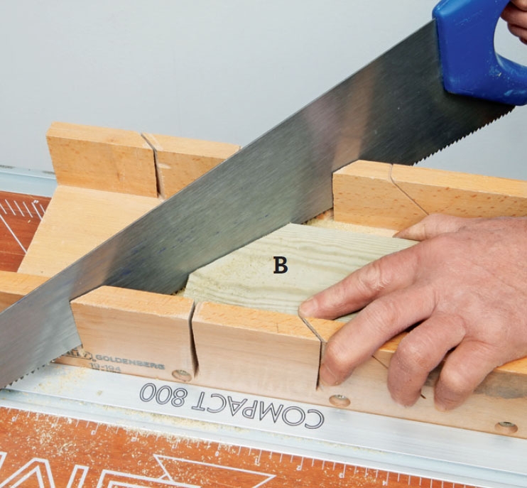 Portin aitalaudat (B) sahataan niin, että niissä on viistot yläpinnat, ja ne jäävät hieman pitkiksi. Sahaa laudat ensin 96 cm:iin tai hieman ylipitkiksi. Tee sitten viisto viilto noin 6 cm:n päähän päädystä. Jos sahaat käsin, käytä apuna jiirilaatikkoa.
