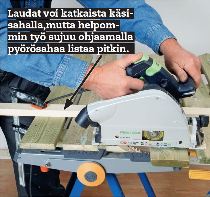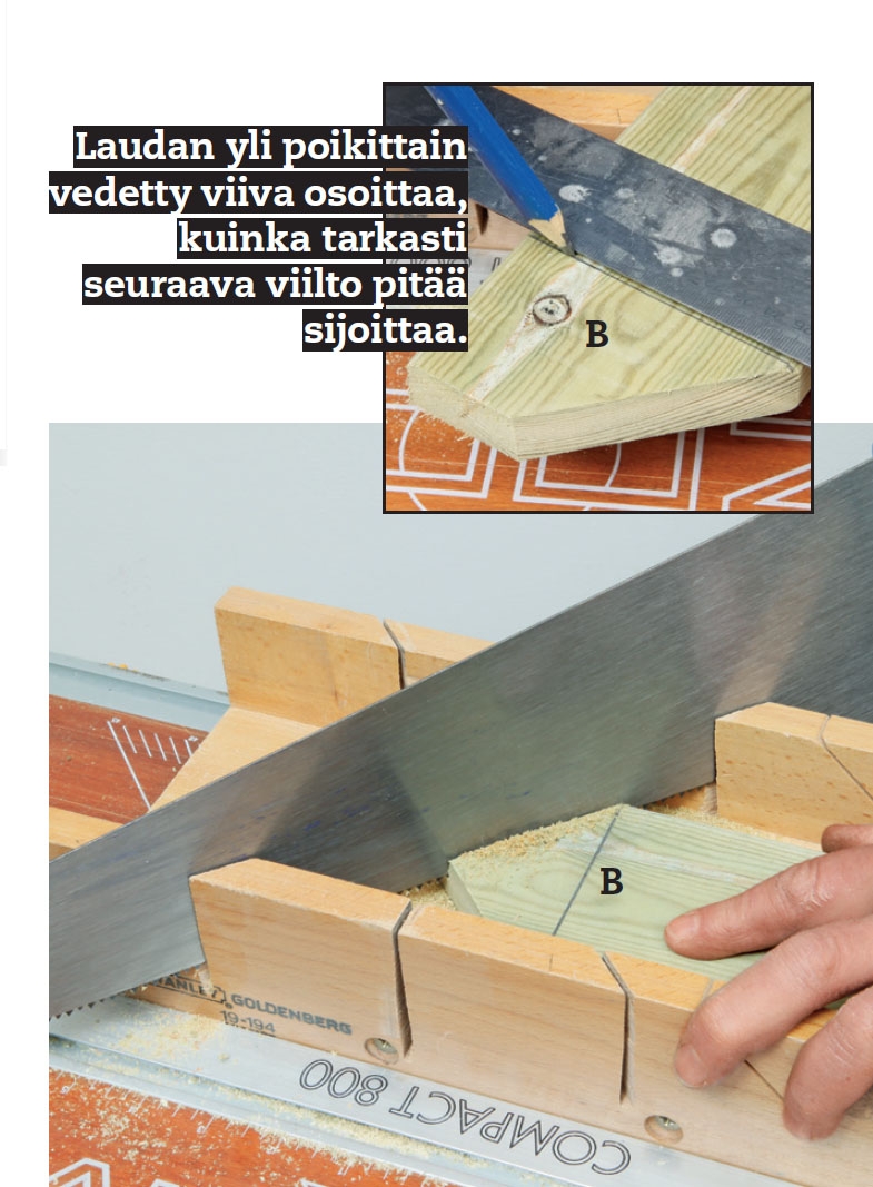 Lautojen alareunat katkaistaan yhdellä pitkällä viillolla. 6 cm:n päähän alimman poikkituen alareunasta tehdään lautoihin merkkiviiva sahausta varten. Viilto tehdään 15°:n kaltevuuteen, joten laudat ovat etupuolelta pidempiä.