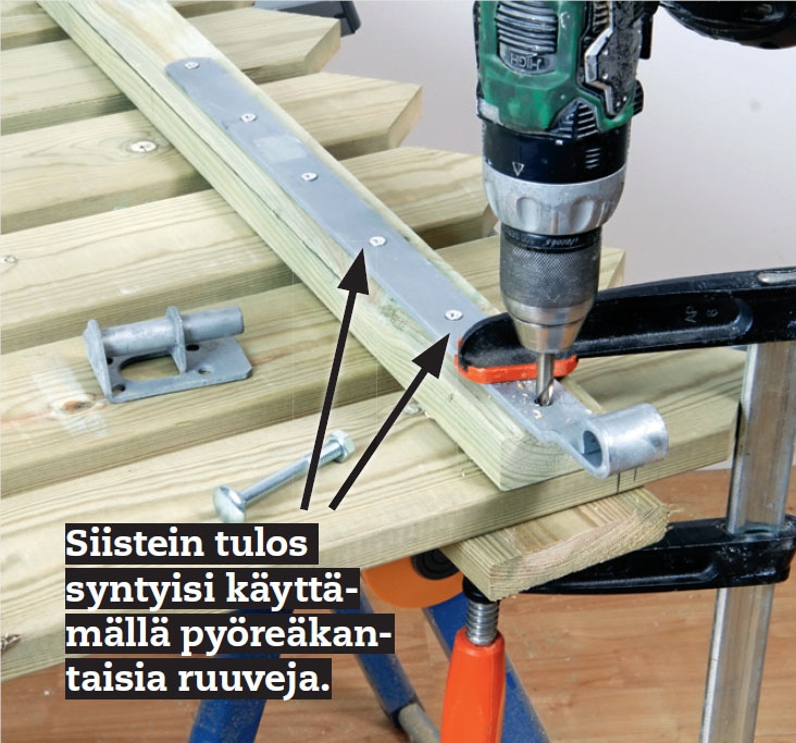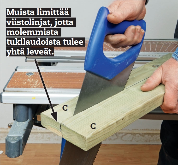 Kaksi poikkitukea (C) sahataan tavallista leveämmästä terassilaudas-ta. Sahaamalla lauta pituussuunnassa hie-man viistoon luodaan kaksi noin 15°:n pintaa, jotka ohjaavat sadeveden pois. Pyörösahalla työ käy hieman nopeammin.