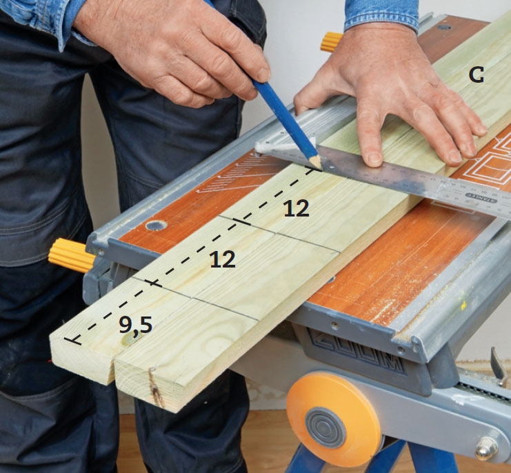 Merkitse poikkilautaan (C) aita-lautojen (B) paikat, jottet joudu mit-taamaan niitä lautoja kiinnitettäessä. Aseta kaksi poikkilautaa tiiviisti toisiaan vastan takareunat vastakkain. Mittaa 9,5 cm laudan päästä ja jaa lauta 12 cm:n pätkiin.