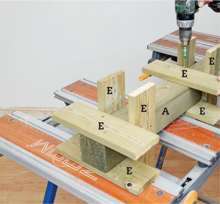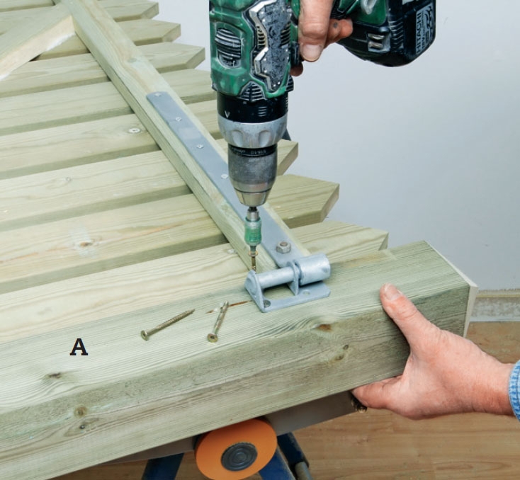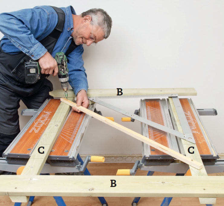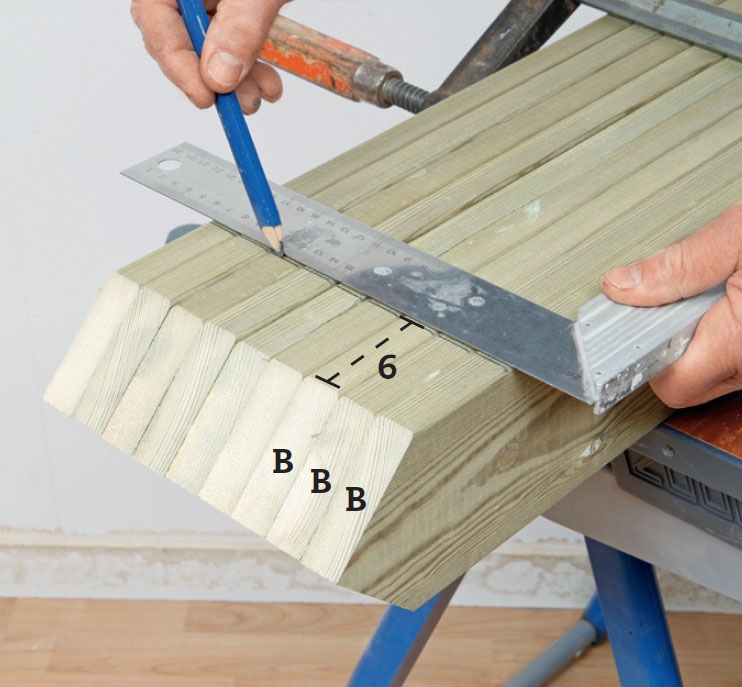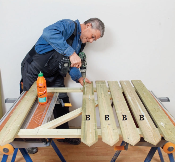 Loput seitsemän lautaa (B) kiinni-tetään liimalla ja kahdella ruuvilla kumpaankin poikkitukeen ja vinotukeen. Työ sujuu helposti ja nopeasti, sillä laudat voi asentaa poikkitukiin ja aitalautoihin tehtyjen merkintöjen mukaan.