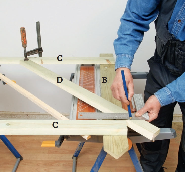 Vinotuki (D) sahataan alinta poik-kitukea (C) vasten 45°:n jiiriviillolla, jonka kaltevuus on 15 astetta. Pidä tämän jälkeen vinotukea kuten kuvassa, merkitse toinen pää, ja sahaa se vastaavalla viillolla.