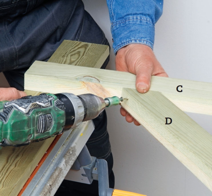 Sivele vinotuen (D) päätyihin liimaa ja asenna se niin, että se aset-tuu samalle kohdalle molempiin poikkitu-kiin (C). Kiinnitä vinotuki poikkilautoihin ruostumattomilla 5 x 60 m ruuveilla. Poista väliaikainen lista, jotta aitalaudoille jää tilaa.