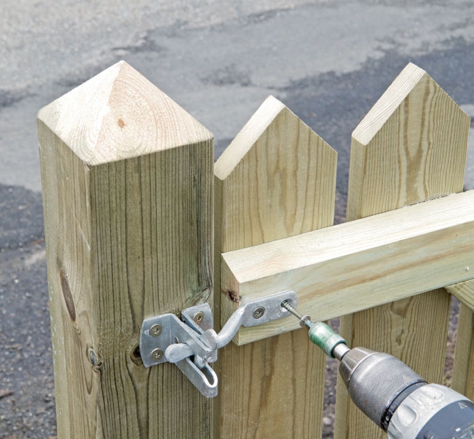 Kun kaikki tukipuut on poistettu, asennetaan portinlukko. Portti saattaa vajota hieman. Portinlukko kiinnite-tään tolppaan ja reunimmaiseen aita-lautaan. Esiporaa reiät, jotta puu ei halkea.