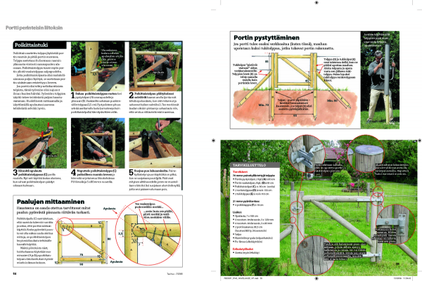 Portin osat kootaan ulkokäyttöön soveltuvilla ruuveilla ja pu-liimalla. Lisäksi porttia vankistetaan upottamalla vaakarakenteisiin neljä pyörötappia. Näin ruuveilla on enemmän pintaa, johon ”sitoutua”. Se on tärkeää, kun portin liitoksista halutaan mahdolli-simman tukevat ja pitkäkestoiset.