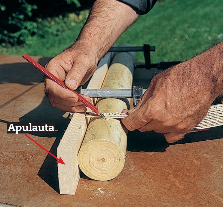 Ensin tolppaan kiinnitetään apulauta. Lauta toimii ikään kuin alustana mittojen ottamista varten. Samalla se estää tolppaa vierimästä mittaamisen ja poraamisen aikana.