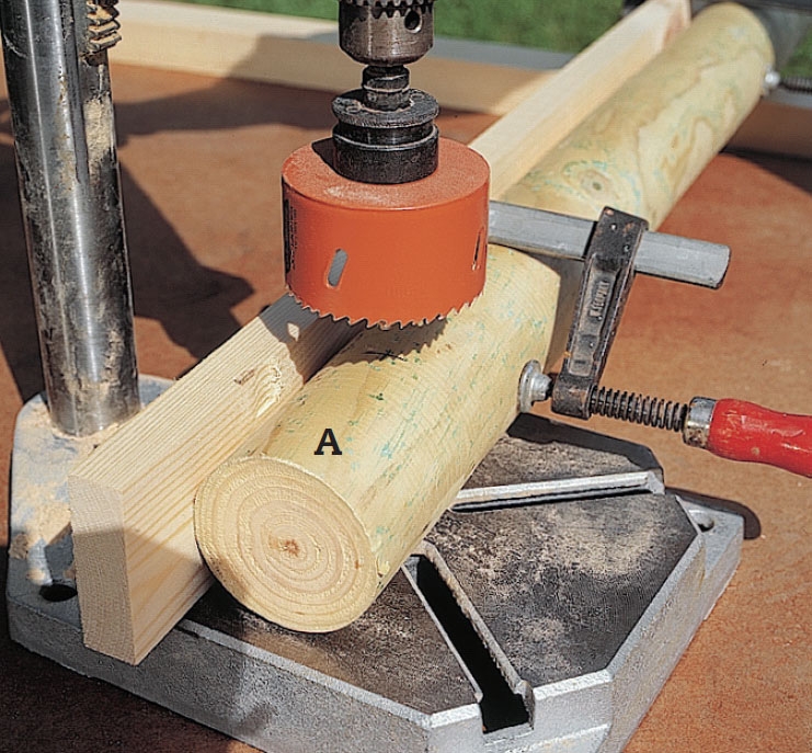 Sahaa molempiin pystytolppiin reiät (A) puoleenväliin tolpan syvyyttä (tässä 3,5 cm). Käytä työhön 70 mm:n reikäsahaa.