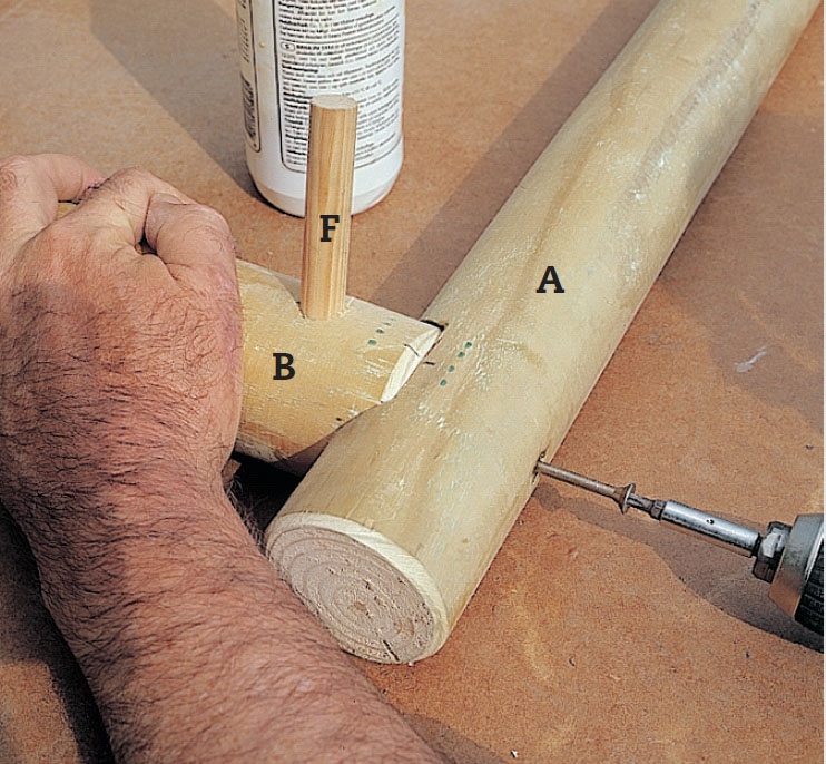 Poraa portin vaakatolppaan (B) reikä (Ø 21 mm) poikittaistappia (F) varten. Puun päädyn lähelle asetetut ruuvit ovat ongelmallisia, joten niille on luotava kiinnityspintaa. Reiän syvyys on vain 6 cm, joten tappi jää hieman esille.