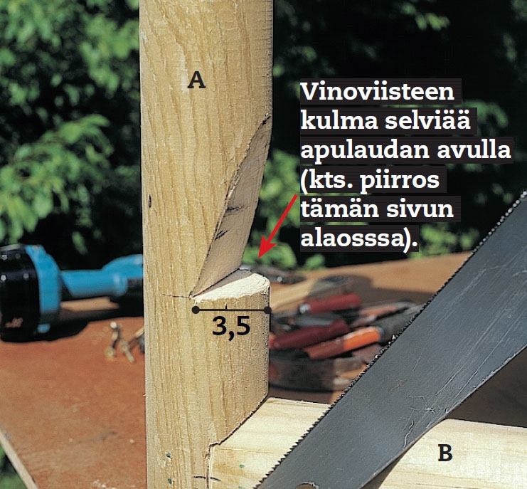 Sahaa poikittaistolppaa varten lovi pystytolpan (A) saranapuolelle ja yläosaan (B). Vaakaviilto sahataan puoleen-väliin tolppaa (3,5 cm). Pystyviisteen pituus selviää asettamalla lauta (sama leveys kuin poikittaistolpalla) kiinnityskohtien väliin.