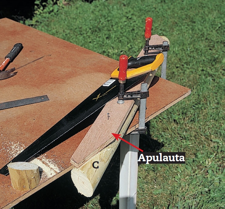 Kiinnitä apulauta poikittaistolppaan (C) parilla naulalla. Nyt voit käyttää lautaa alustana, kun sahaat poikittaistolpan päädyt oikeaan kulmaan.