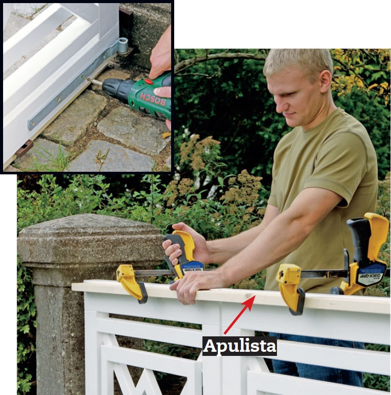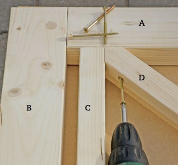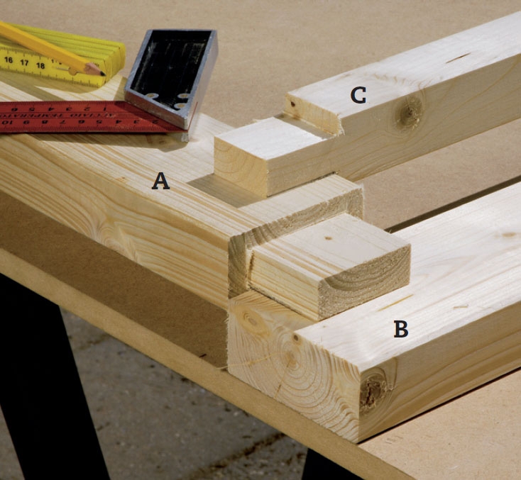 Kehys on koottu tasoreikäliitoksilla. Tapitus on aito puusepänmenetelmä, jolla aikaansaadaan erittäin vahva liitos. Jos et uskalla ryhtyä tekemään tarkkoja tasoreikäliitoksia, voit tehdä ristilapalii-toksia, jollaisia on käytetty portin sisä-osan kuvioissa. Silloin listojen A ja C on oltava pitempiä kuin tässä, koska ne on upotettava kauttaaltaan listojen B ja A päälle. Lapaliitoksetkin on tapitettava.