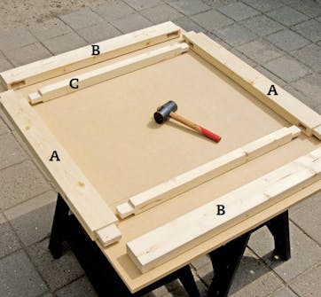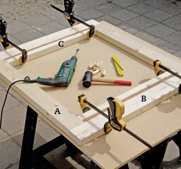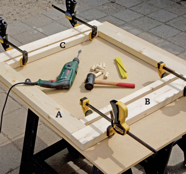Kokoa kehys väliaikaisesti (ilman liimaa). Naputa ensin kaksi pysty-suoraa sivua (A) yhteen listojen (C) kanssa. Käytä kumivasaraa. Naputa sen jälkeen kiinni ala- ja yläkappaleet (B). Purista osat täysin tiiviisti yhteen ruuvipuristimilla.