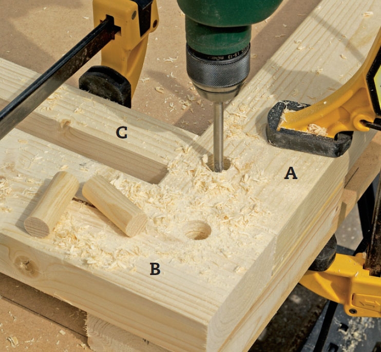 Merkitse tapin reiän keskikohta ja merkitse naskalilla tarkka porauskohta. Poraa huolellisesti kehys-osan (A) leveitä tappeja varten kolme (pystysuoraa) reikää ja listojen (C) pieniä tappeja varten kaksi reikää.