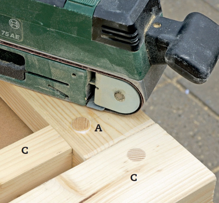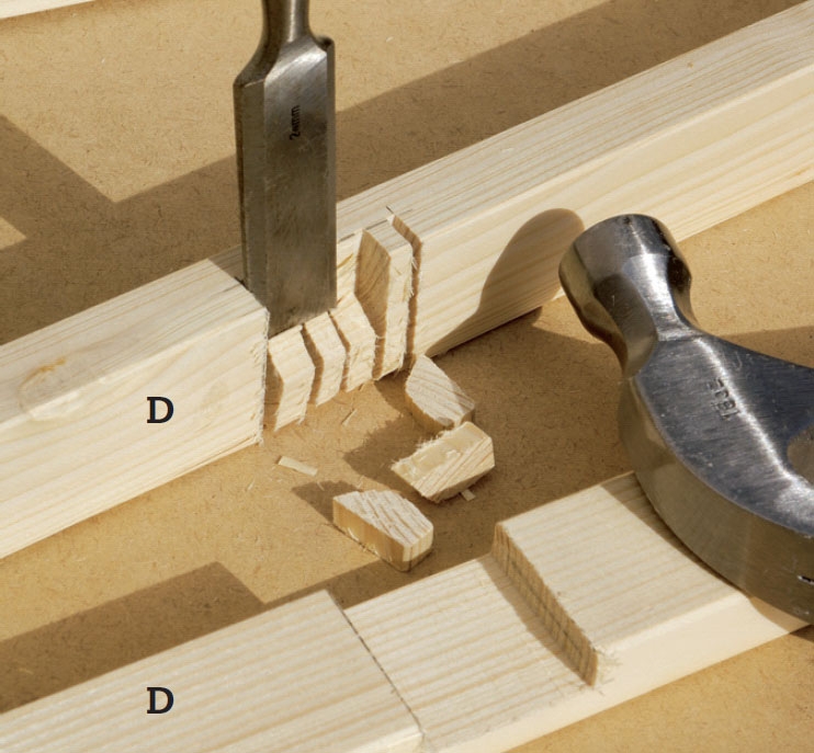 Kaikki tapit ovat 5 cm pitkiä. Poista ensin 5 cm:n pituisten tappien olkapäät pystysuorista kehysosista (A) ja listoista (C). Käytä käsi- tai selkäsahaa. Myös muut tapit voi tehdä sahaamalla, mutta tässä käytämme talttaa.